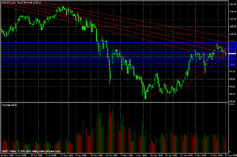 The Yen is strengthening slightly against the Dollar again, but the USD/JPY is presently finding strength in our 1st tier uptrend line. Weakness in the USD/JPY reflects the selloff taking place on Wall Street premarket Monday morning.